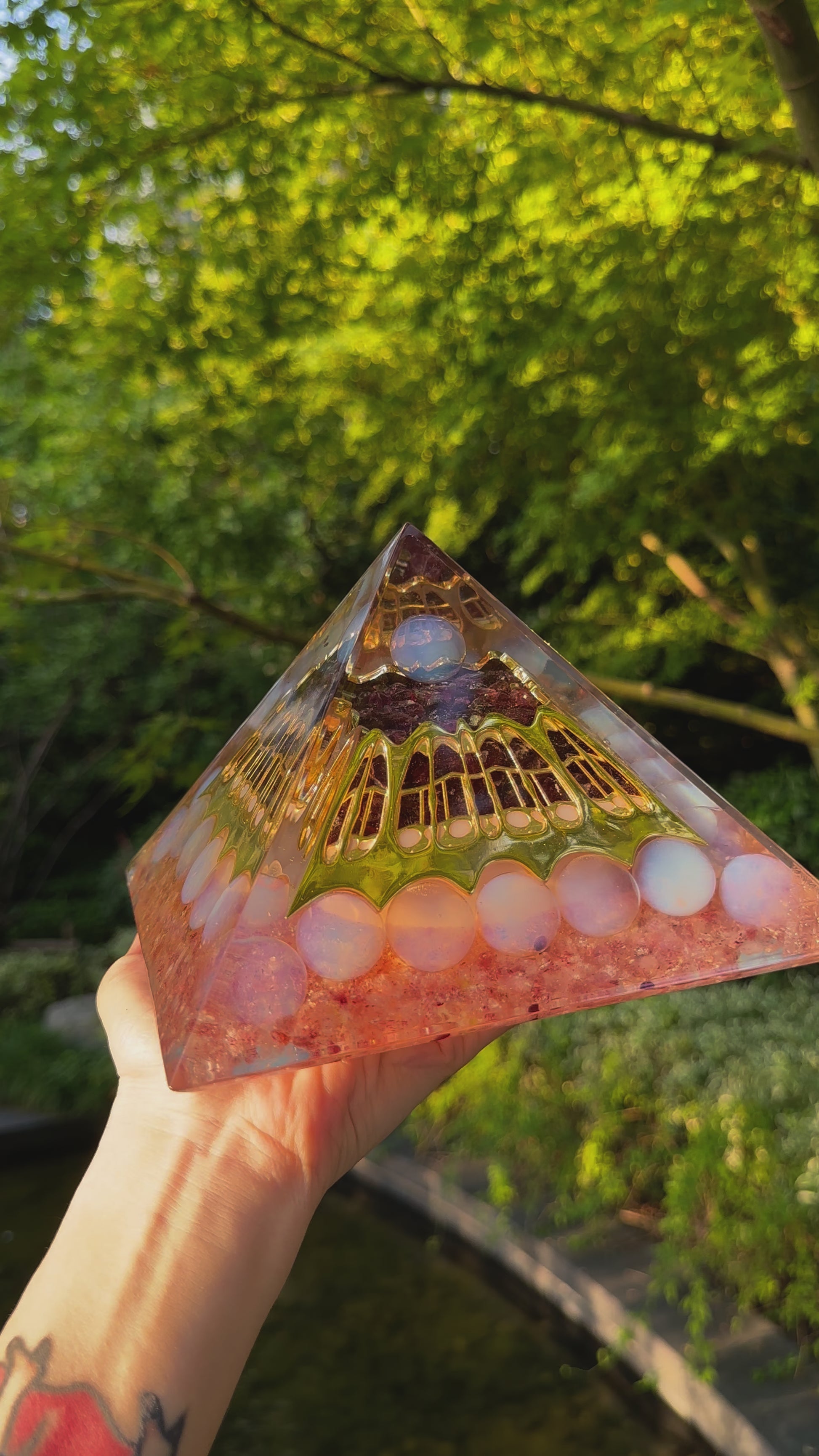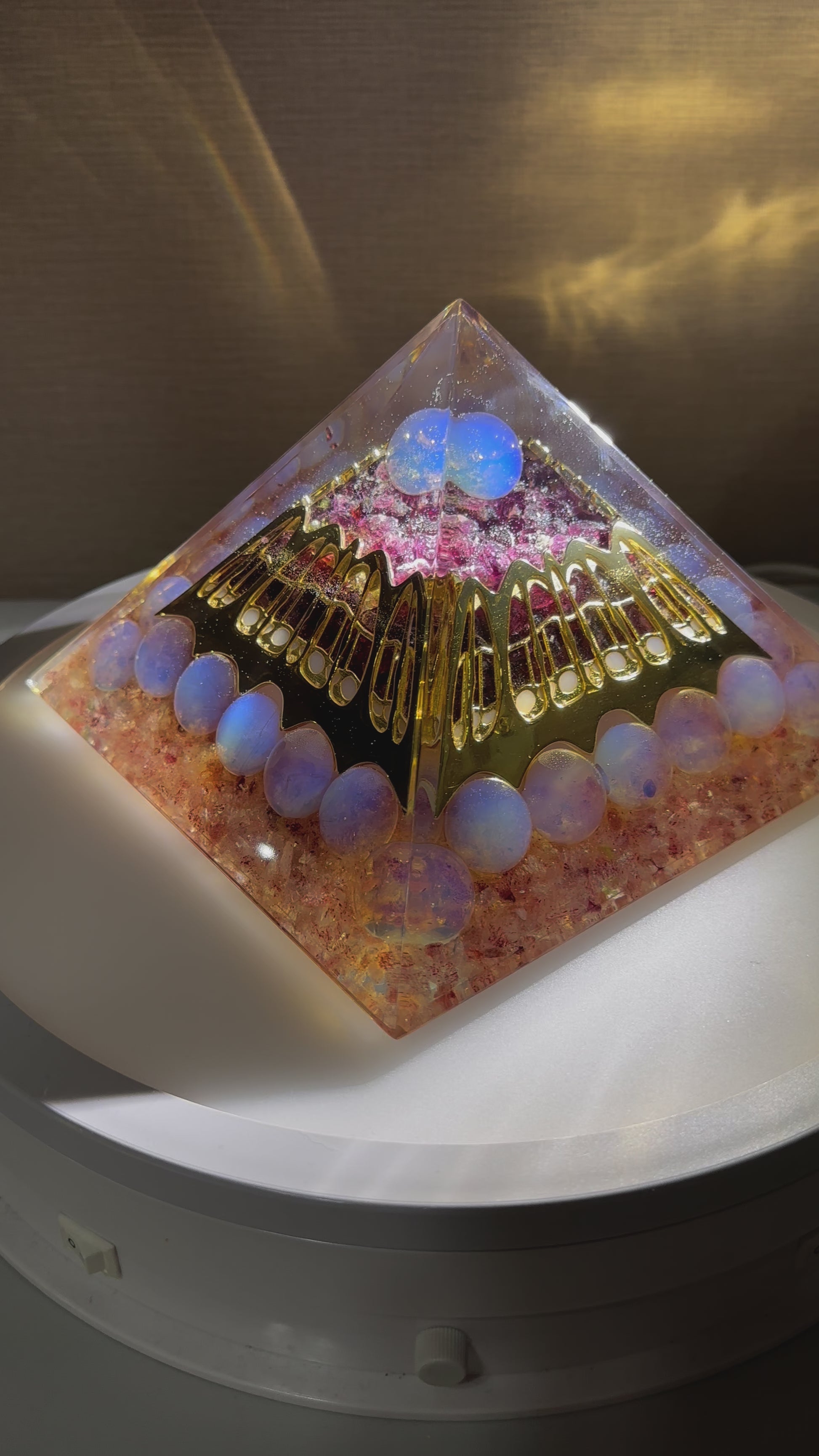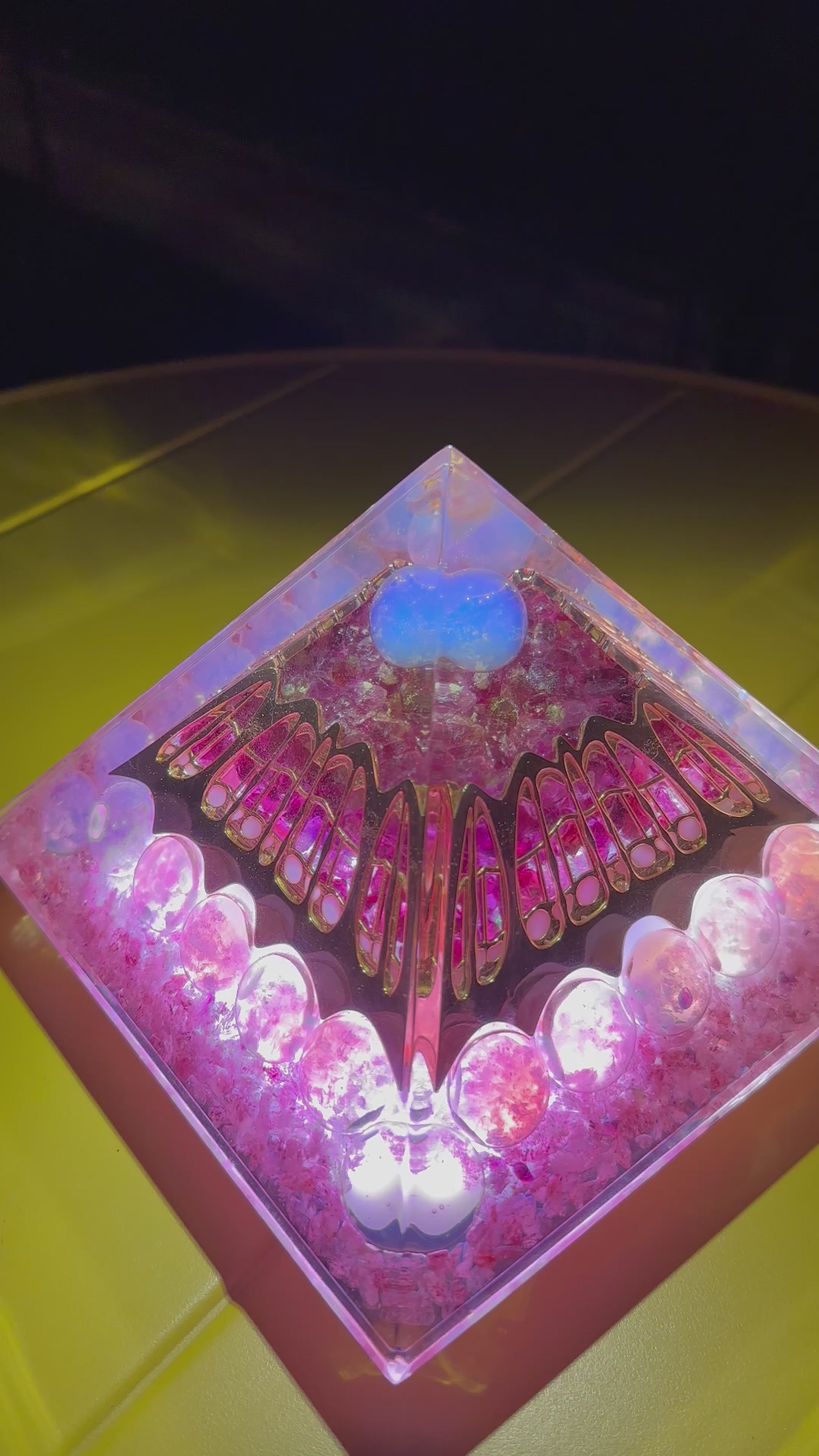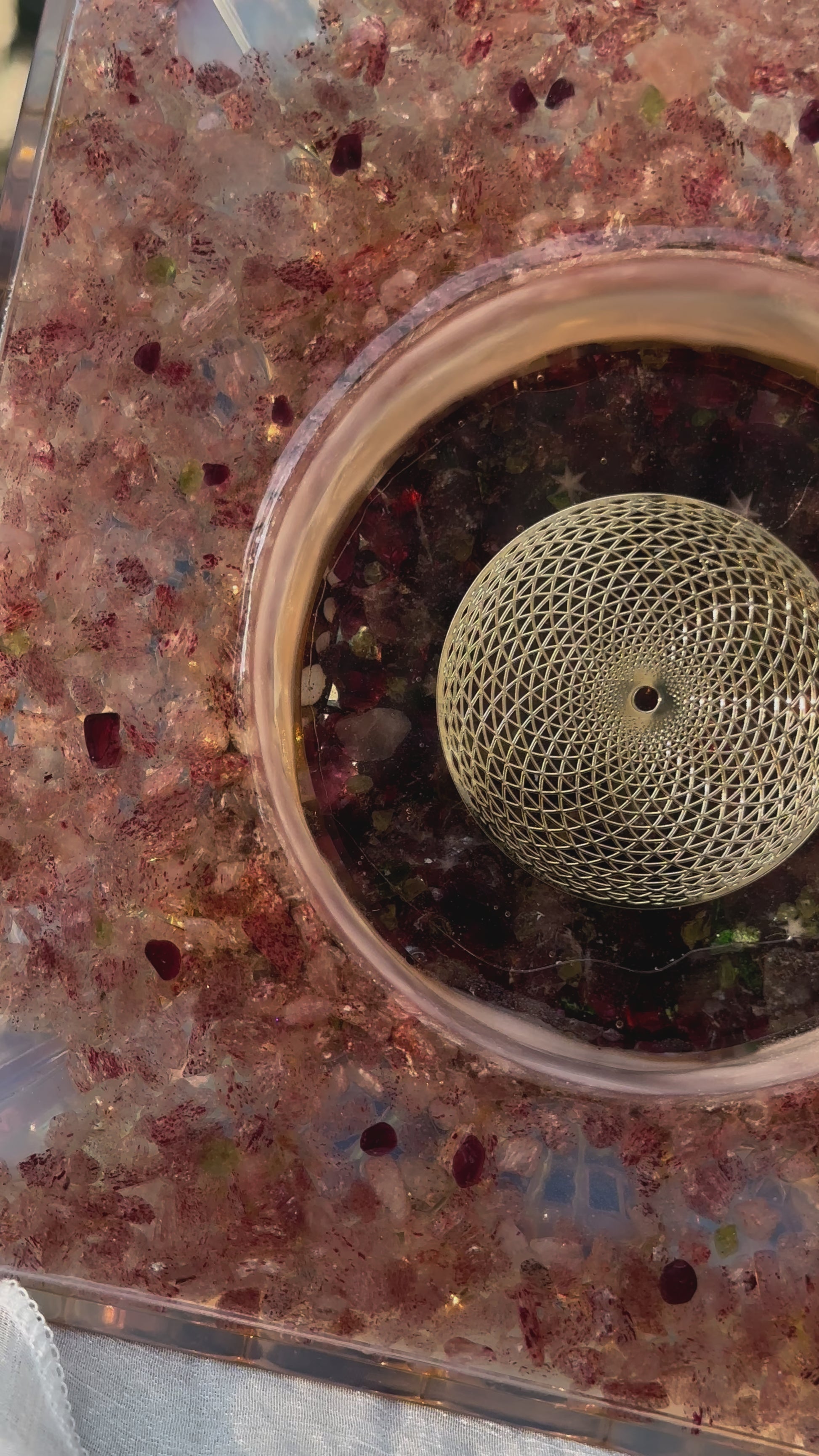 Inspirado por la Casa Batlló de Gaudí, está hecho de cuarzo fresa, granate, esferas de ópalo y accesorios metálicos especialmente diseñados con la forma de las ventanas del salón de la Casa Batlló. Te trae frecuencias vibratorias de felicidad y prosperidad.